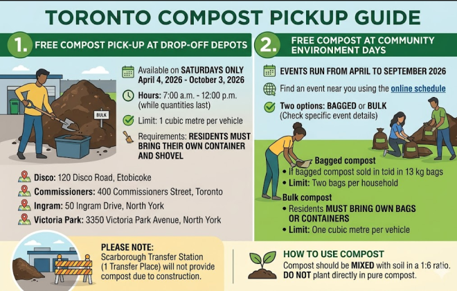 规则: 仅限多伦多居民,每辆车限领 1 立方米。必须自带铲子和容器(散装堆肥)。